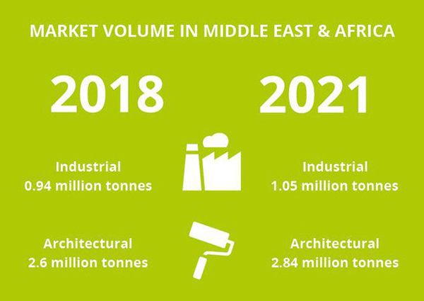 非洲工业涂料市场价值约为11.4亿欧元,建筑涂料市场价值约为20.9亿欧元。中东工业涂料市场价值约为22.8亿欧元,建筑涂料市场价值约为21.1亿欧元。
