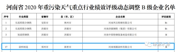 2021年3月17日,据河南省生态环境厅发布的公告显示,河南颂源涂料有限公司成功被评选为河南省水性涂料行业B级绩效企业,成为河南省内水性涂料行业唯一一家入选的企业!