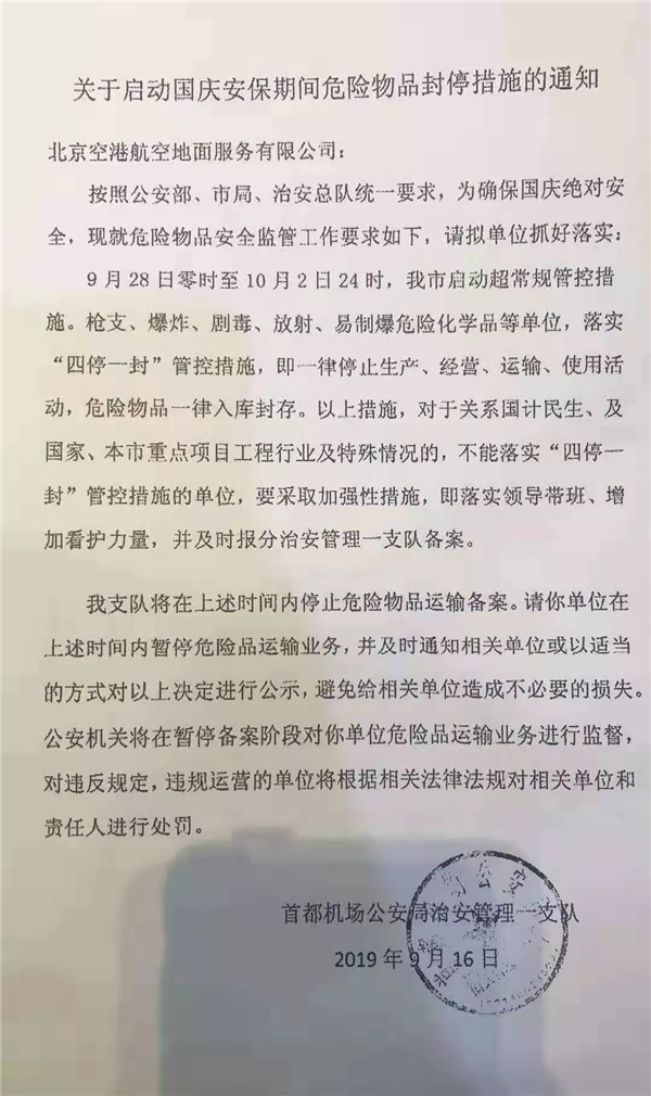 届时,北京首都机场将在上述时间内暂停危险品运输业务。